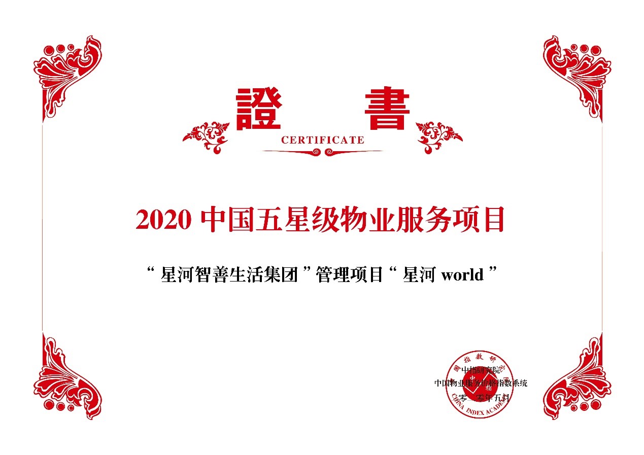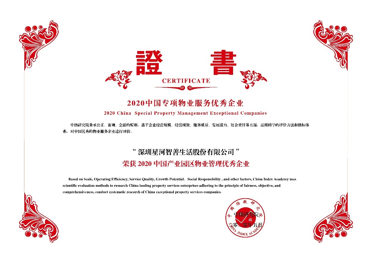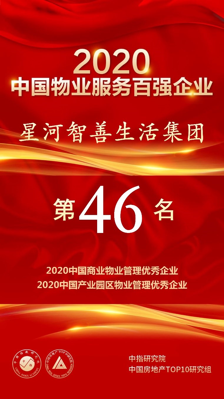 5月13日,由中国指数研究院、中国房地产TOP10研究组共同主办的“2020中国物业服务百强企业研究成果发布会暨第十三届中国物业服务百强企业家峰会”在北京隆重召开。星河智善生活凭借强劲的综合实力、高质量的服务品质、优秀的服务口碑,荣膺“2016-2020连续五年中国物业服务百强企业”,位列第46名,“2020中国产业园区物业管理优秀企业”和“2020中国商业物业管理优秀企业”。同时,在管项目深圳星河world和常州星河丹堤荣获“2020中国五星级物业服务小区”。