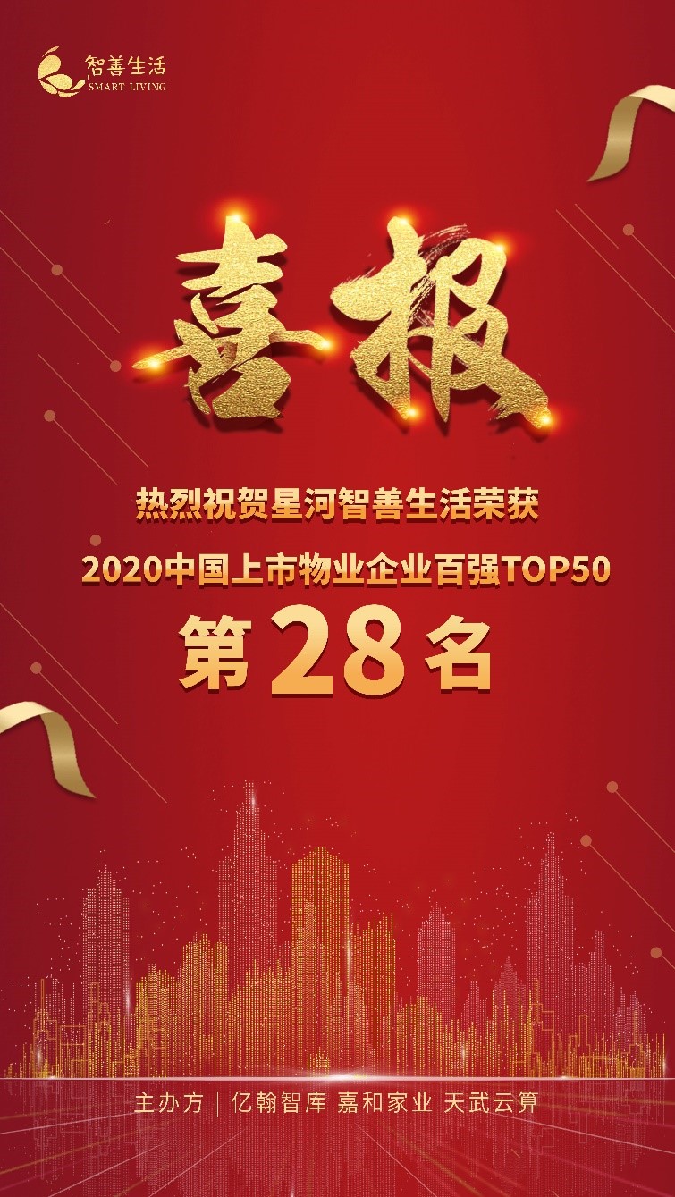 2020年5月28日,由亿翰智库、嘉和家业物业服务研究院、天武云算主办的“中国上市物业企业百强”研究成果正式发布。星河智善生活凭借强劲的综合实力和良好的发展潜力,荣获“2020中国上市物业企业TOP30”,位列第28名。