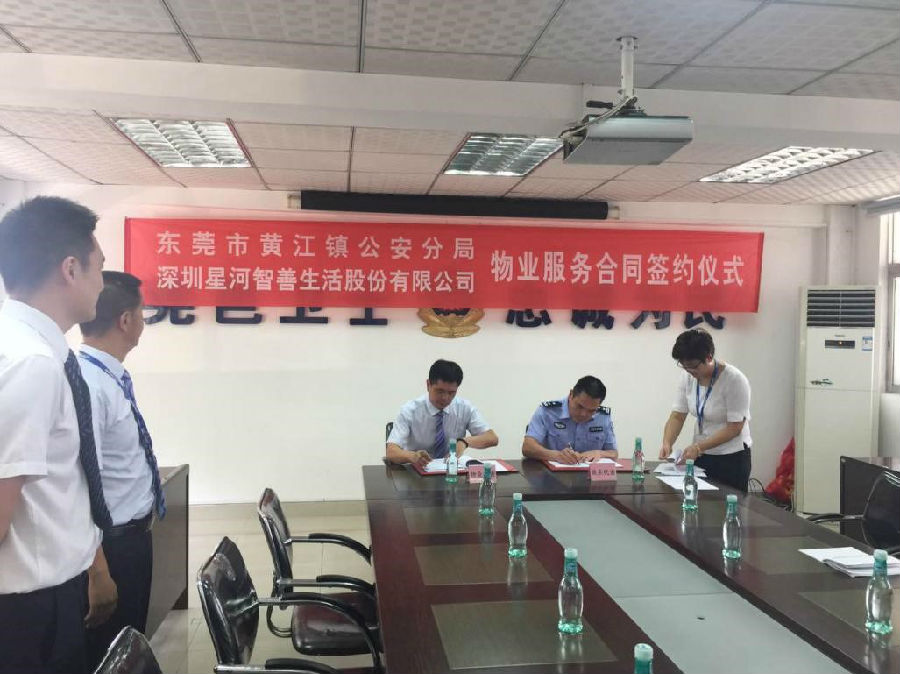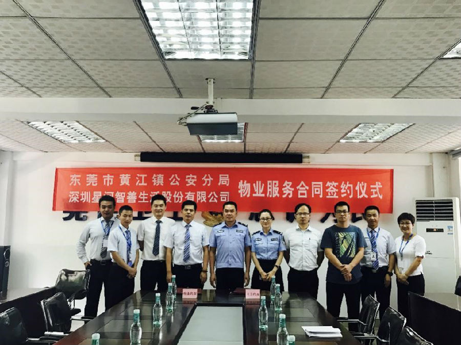 2017年6月30日下午15:00,星河智善生活公司与东莞黄江镇公安分局签立物业服务合同。公安分局办公室主任翟绍华、公安局勤务中队长谢彩虹,智善生活副总经理王如波,智善生活深正分公司副总经理钮超等领导共同见证了双方的签约仪式。