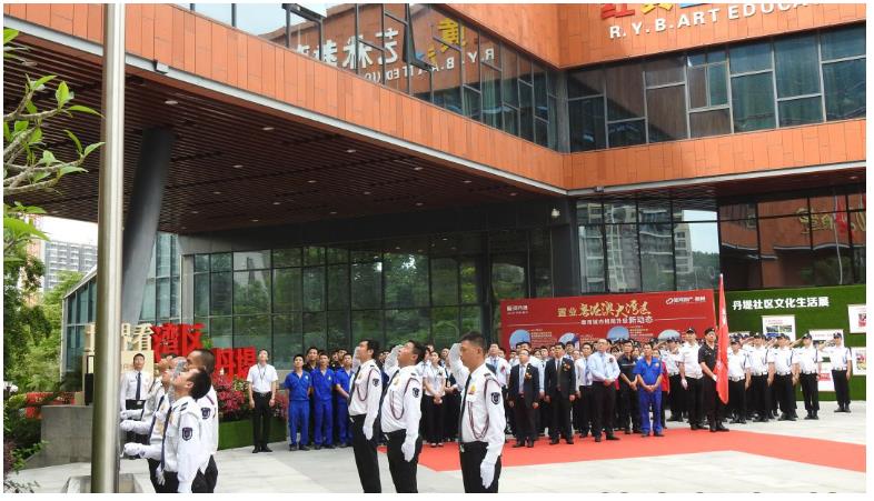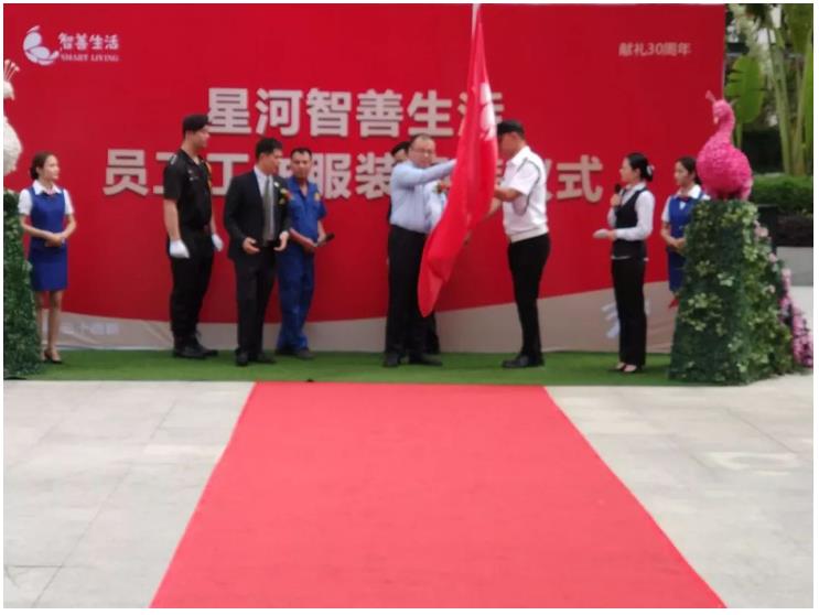 2018年5月1日上午,《献礼30周年·星河智善生活员工工作服装换装仪式》在惠州星河丹堤营销中心隆重举行,全体员工均统一换上新式服装。当主持人介绍完到场的嘉宾后,现场掌声雷动。伴随着铿将有力的国歌,五星红旗冉冉上升,换装仪式正式开始。