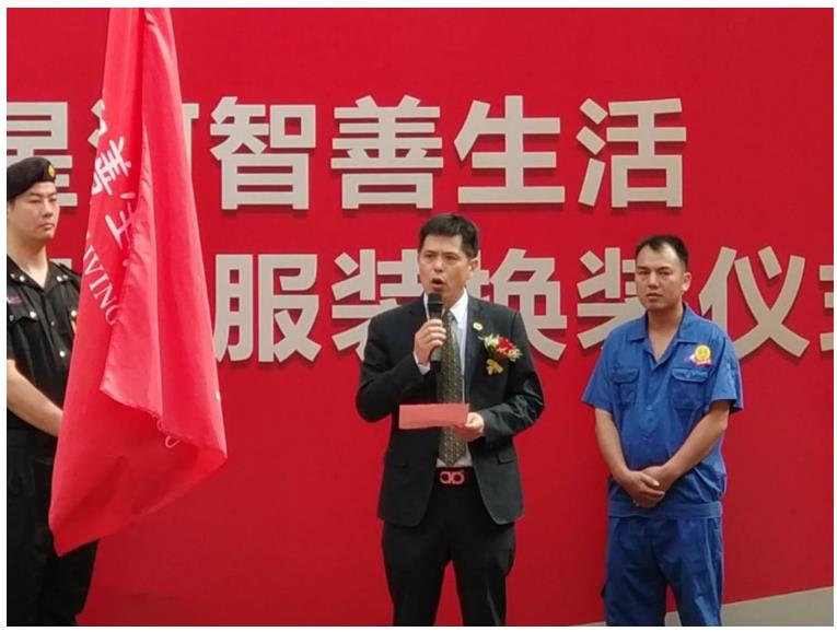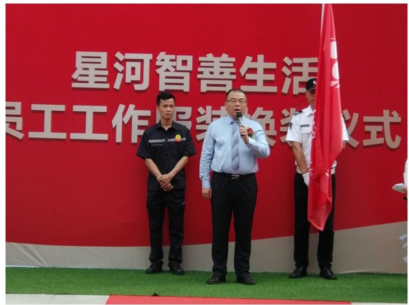 王总发言完毕后,接下来是整个仪式最关键的部分——新旧装传承。王总手举星河智善生活司旗,郑重地将其交给智善生活总经理李炯,主持人“谢谢你,旧工装!你好,新工装!”的旁白回响在在场每个员工的耳畔,也回荡在大家激扬澎湃的心中,把现场气氛一度推向了高潮。