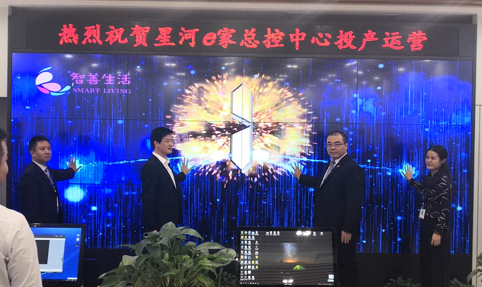 现场会议结束后,在吴雪懿总的带领下,各位领导、同事移步至星河e家总控中心现场进行了正式的启动仪式。林培涛总、李炯总、吴雪懿总、罗成总一同将手按在大屏幕上,在震撼的音乐声中,星河e家总控中心正式启动、投产运营。