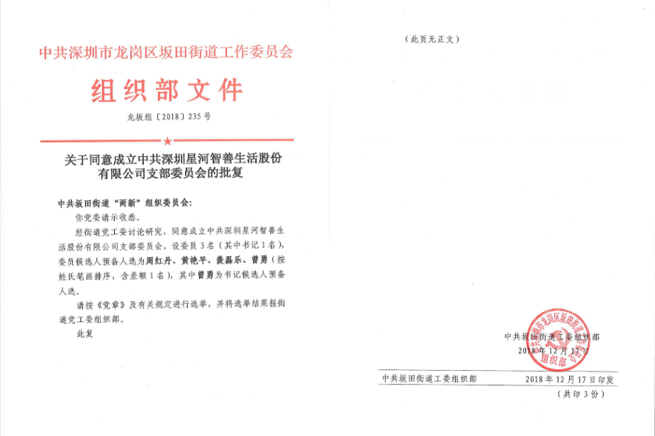 为深入贯彻党的十九大精神,学习习近平总书记的重要讲话精神,深入贯彻落实党的方针政策,规范公司党员管理,发挥党组织的战斗堡垒作用和党员的先锋模范作用。2018年12月17日,经中共深圳市龙岗区坂田街道工作委员会批复同意,中共深圳星河智善生活股份有限公司支部委员会正式成立。
