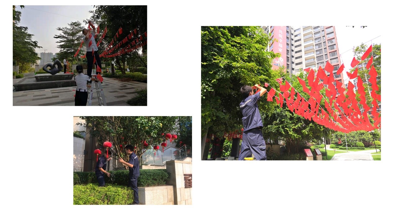 同时,为喜迎七十华诞,共庆祖国生日,展现祖国迈入新时代的新气象、新风貌,营造庄严喜庆、文明和谐的节气氛围,星河智善生活在各园区精心装扮,用最美好的行动献礼祖国。
