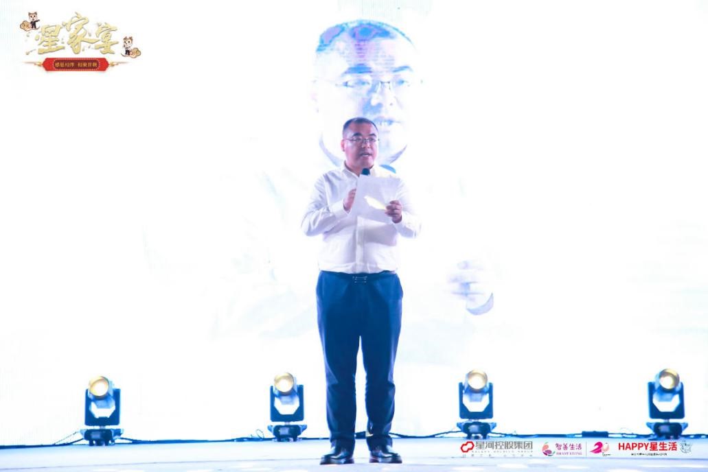 星家宴晚会正式开始,由星河智善生活集团运营管理中心总监吴雪懿致开场辞,热烈欢迎所有星河业主家人们的到来,紧接着星河智善生活集团领导们和现场所有来宾共同举起酒杯,同祝星河智善生活20周年生日快乐。