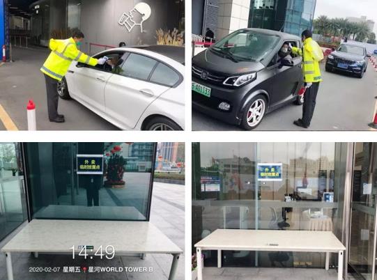严格落实车辆、人员进出管理。设立出入口管控点,各出入口24小时均配备测温人员和测温仪,每一位出入大厦人员必须佩戴口罩,门岗严格检查并进行非接触式红外测温,体温在37.3℃(含)以下方可进入,有疑似发热的员工建议就医检查,礼貌劝阻进入大厦;快递、外卖无接触配送,严禁快递、外卖人员进入大厦,可将物品放在指定的临时接收或存放点,供客户收取。