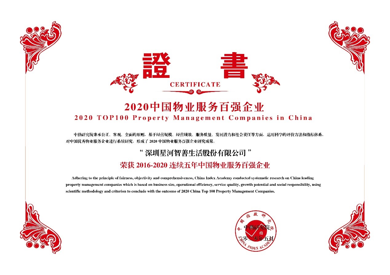5月13日,由中国指数研究院、中国房地产TOP10研究组共同主办的“2020中国物业服务百强企业研究成果发布会暨第十三届中国物业服务百强企业家峰会”在北京隆重召开。星河智善生活凭借强劲的综合实力、高质量的服务品质、优秀的服务口碑,荣膺“2016-2020连续五年中国物业服务百强企业”,位列第46名,“2020中国产业园区物业管理优秀企业”和“2020中国商业物业管理优秀企业”。同时,在管项目深圳星河world和常州星河丹堤荣获“2020中国五星级物业服务小区”。